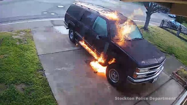 Am hellichten Tag zündet ein unmaskierter Täter ein Auto in einem Wohngebiet an. Die Polizei aus dem amerikanischen Ort Stockton sucht seit Mittwoch einen Mann, der ziemlich rabiat und auffällig den Wagen in Brand setzte.