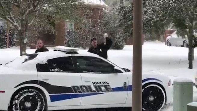 In Rincon in den USA haben sich zwei Cops mit Passanten eine Schneeballschlacht geleistet. Obwohl sie in der Unterzahl waren, haben sie sich tapfer geschlagen.